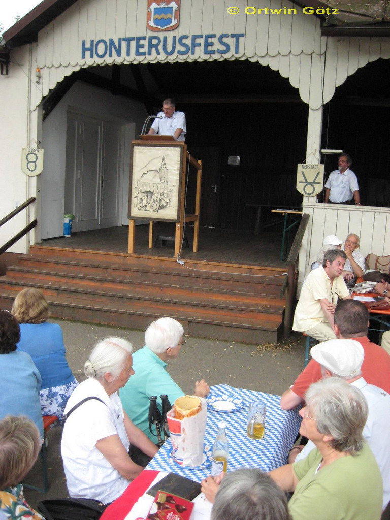 Liebe Landsleute, das wertvolle Kulturerbe, das uns unsere Vorfahren hinterlassen haben, nimmt uns gemeinsam in die Pflicht, die Kronstädter hier in Deutschland und die Kronstädter, die noch in Siebenbürgen leben. Gerade das Honterusfest, an dessen Tradition nicht nur hier in Pfaffenhofen, sondern auch wieder in Kronstadt angeknüpft wird, ist dafür ein gutes Beispiel. Denn in Kronstadt wird seit dem Jahr 1992 wieder alljährlich – in der Regel Ende Mai, Anfang Juni – das Honterusfest gefeiert. Diese Kronstädter Honterusfeste neueren Datums haben nicht mehr die Dimensionen der Honterusfeste aus der Vorkriegszeit, es handelt sich nun wieder eher – so wie das am Anfang war - um das Schulfest der Honterusschule, in der weiterhin in deutscher Sprache unterrichtet wird, auch wenn die große Mehrheit der Schüler zu Hause, in der Familie, Rumänisch oder Ungarisch spricht. Zum Programmablauf dieser neuen Kronstädter Honterusfeste gehört eine gemeinsame Wanderung der Schüler, Lehrer, Eltern und Freunde der Schule vom innerstädtischen Schul- und Kirchhof in die Schulerau, auf eine schöne Wiese auf dem Langen Rücken, wo dann mit viel Juchhe Spiele gespielt sowie Sportwettkämpfe veranstaltet werden. Ein Höhepunkt ist, wie früher auf dem Kleinen Hangestein, das Fußballspiel der Zwölftklässler mit den Professoren. Und die Burzenländer Blaskapelle ist auch jedes Mal zur Stelle. Auf die „Quellenrede“ wurde allerdings leider verzichtet.