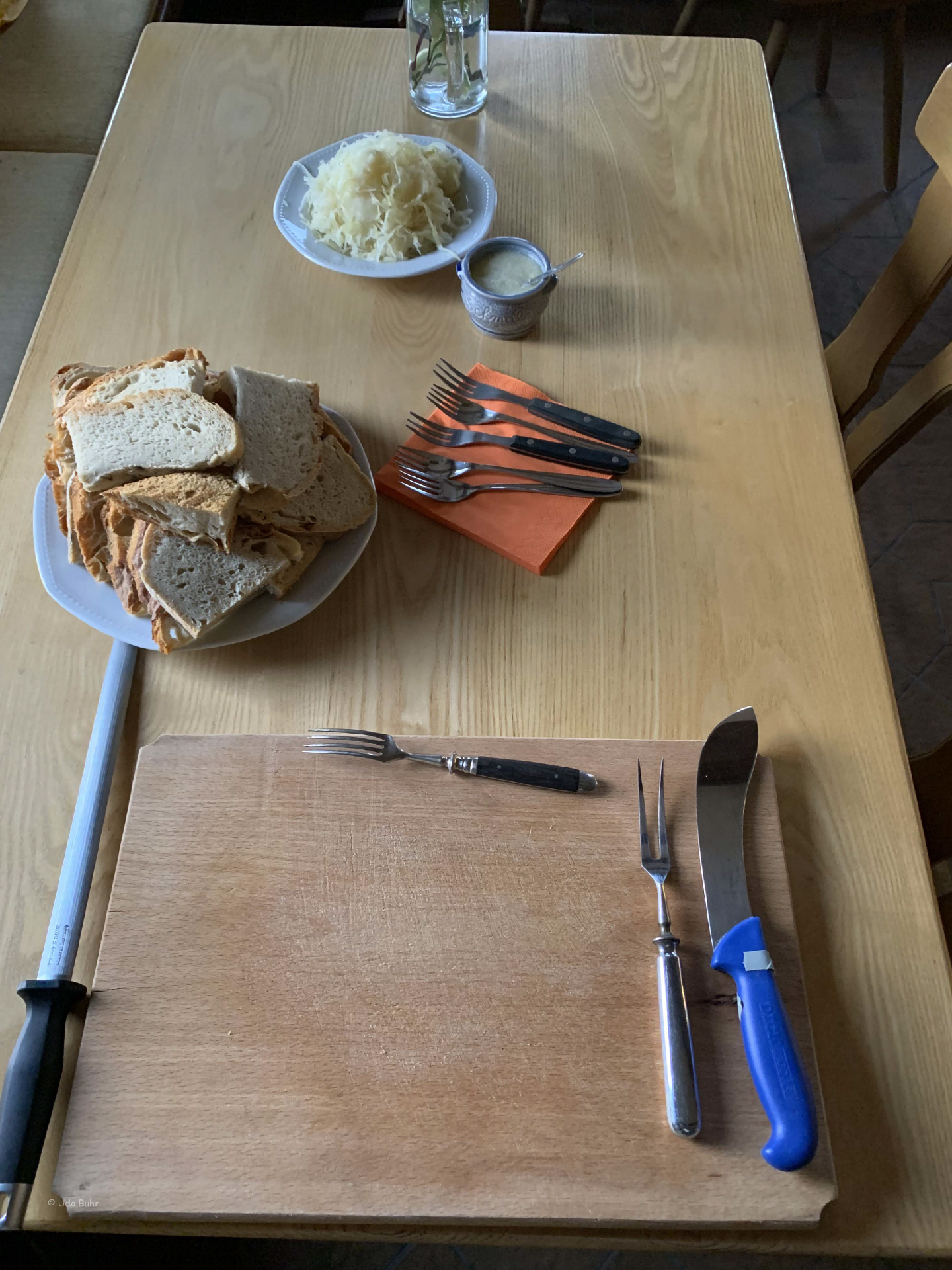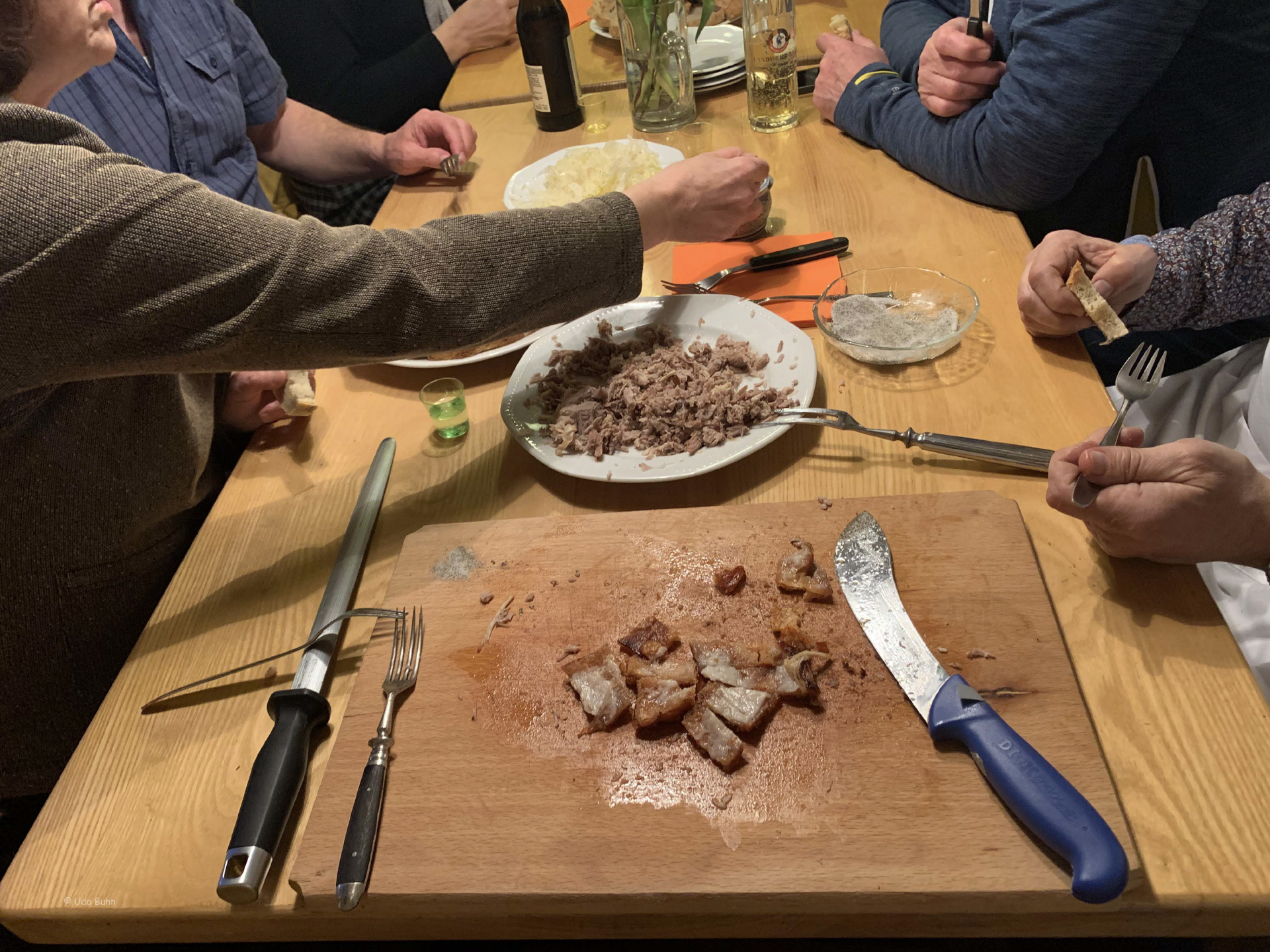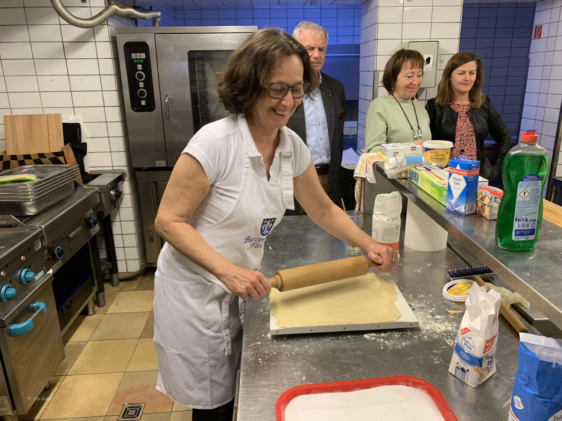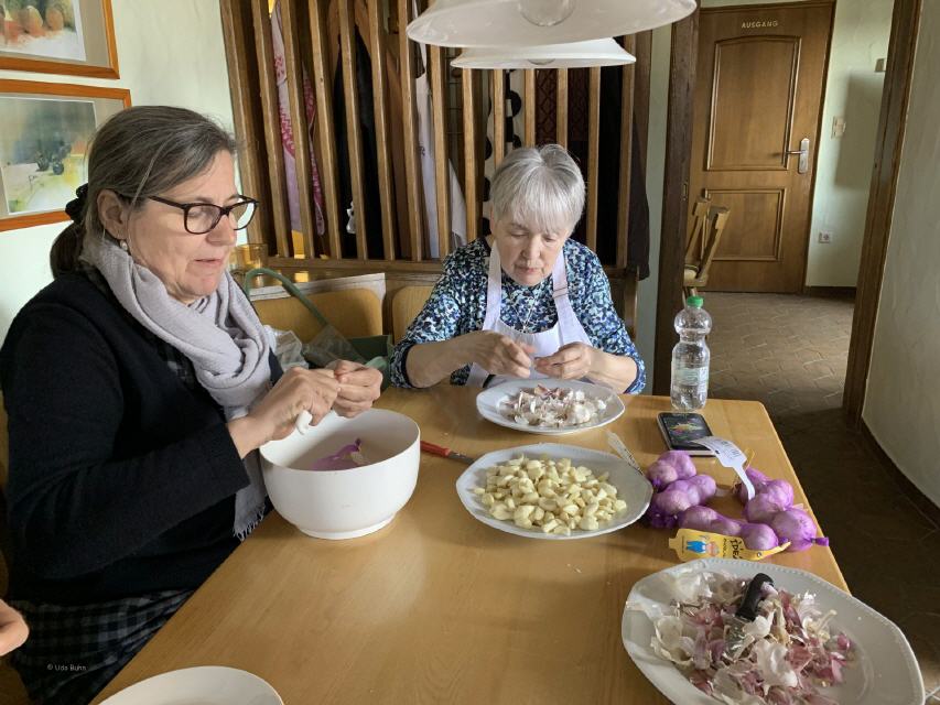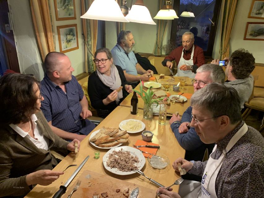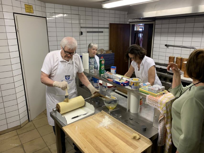Der Workshop „Baumstriezel backen leicht gemacht“, geleitet von Karl-Heinz Brenndörfer, Ehrenvorsitzender des HOG-Verbandes in Deutschland, fand großen Anklang. Er erläuterte die Entstehung des beliebten siebenbürgischen Gebäcks und stellte diverse Backmethoden vor. Da nicht immer am offenen Feuer gebacken werden kann, musste eine Alternative her. Karl-Heinz Brenndörfer funktionierte einen kleinen elektrischen Grill um und führte ihn uns gleich vor. So wurden wir mit köstlichem Baumstriezel verwöhnt. Renate und Helfried Götz ließen es sich auch diesmal nicht nehmen, den schon zur Tradition gewordenen Burzenländer „Fleken“ zuzubereiten. Der Samstagabend klang in geselliger Runde aus.